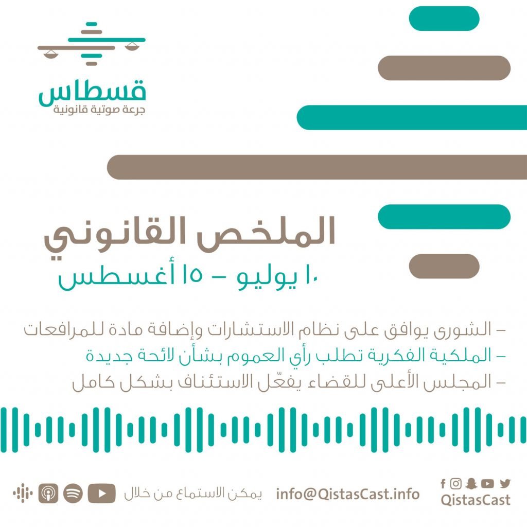 موافقة مجلس الشورى على إضافة مادة لنظام المرافعات الشرعية تتعلق بالولاية المالية على من بلغ 18 عامًا، وكذلك موافقة المجلس على مشروع نظام الاستشارات في المجالات المالية والاقتصادية والإدارية. ومن الأخبار أيضًا دعوة الهيئة السعودية للملكية الفكرية العموم لتقديم مرئياتهم حول “مشروع لائحة ترخيص ممارسة أعمال الملكية الفكرية” حيث نستعرض بعض شروط الحصول على الترخيص باختصار. كذلك قرار المجلس الأعلى للقضاء الذي فعّل قضاء الاستئناف بشكل كامل، وقراره الآخر الذي يحدد القضايا اليسيرة التي لا تقبل الاستئناف. واستمرارًا لآثار الجائحة على الأنظمة والإجراءات فقد أصدر مجلس القضاء الإداري قرارًا يضيف مادة ويحذف أخرى ويعدل ثالثة من اللائحة التنفيذية لنظام المرافعات أمام ديوان المظالم في إطار تبادل المذكرات إلكترونيا. وأخيرًا: السبب وراء عدم انعقاد مجلسي الوزراء والشورى في بعض الأوقات من السنة.