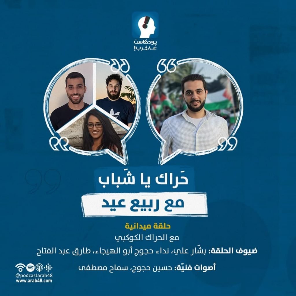 في الحلقة الخامسة من بودكاست “حَراك يا شباب”، نتوجه إلى قرية كوكب أبو الهيجاء في حلقة ميدانيّة للتعرّف على “الحراك الكوكبي”، وهو حراك شبابي مستقل تأسس حديثًا، بدأ تأسيسه قبل الهبّة الشعبيّة الأخيرة في فلسطين، وانطلق بتنظيم سلسلة نشاطات بعد الهبّة من خلال أسبوع الاقتصاد الوطني وأسبوع الثقافة الفلسطيني الموحد. تحدثنا مع الناشطين في الحراك بشّار علي، نداء حجوج هيجا وطارق عبد الفتاح حول نشاطات وأهداف الحراك، وعن الهبّة الشعبيّة الأخيرة وحملة الاعتقالات في كوكب أبو الهيجاء، وعن تطلّعاتهم لتنظيم للعمل الشبابي والسياسي والاجتماعي في كوكب وربطه مع القضايا الوطنيّة العامّة لنسلّط الضوء على تجربة هذا الحراك الناشئ. كذلك نستضيف في هذه الحلقة أصوات فنيّة شاركوا في نشاطات الحراك، كل من الشاب حسين حجوج والفنانة سماح مصطفى.